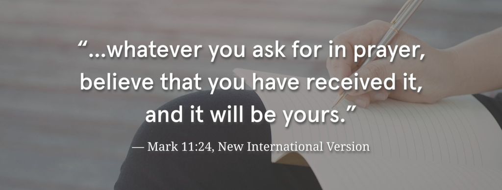 “‘Have faith in God,’ Jesus answered. ‘Truly I tell you, if anyone says to this mountain, ‘Go, throw yourself into the sea,’ and does not doubt in their heart but believes that what they say will happen, it will be done for them. Therefore I tell you, whatever you ask for in prayer, believe that you have received it, and it will be yours.’”